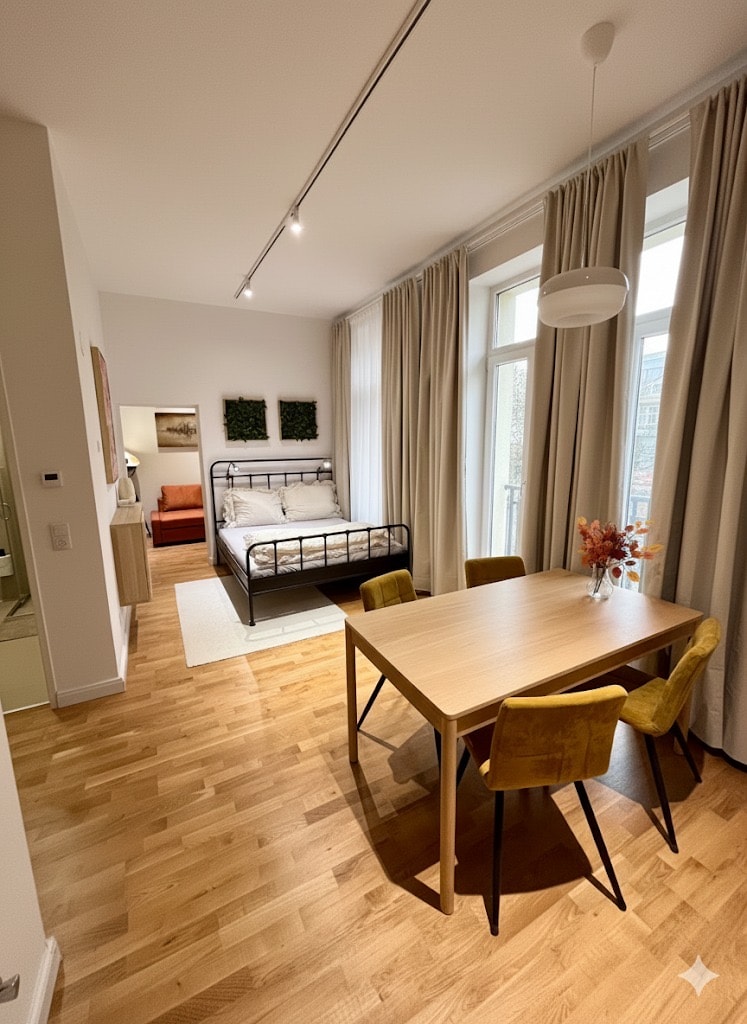 Ef þú ert að leita að einstaklingi og á sama tíma þægilegri gistiaðstöðu er þetta rétti staðurinn! Innréttingarnar samanstanda aðallega af einstökum munum sem hafa verið endurgerðir á ástúðlegan hátt. Hér þarf enginn að gera það án lúxus! Öll íbúðin hefur verið endurnýjuð og uppfærð. Við erum sérstaklega stolt af stílhreina og mjög þægilega rúminu sem við bjuggum til sérstaklega fyrir þessa íbúð. Stofa 27 m2, forstofa, baðherbergi, stofa/svefnsalur