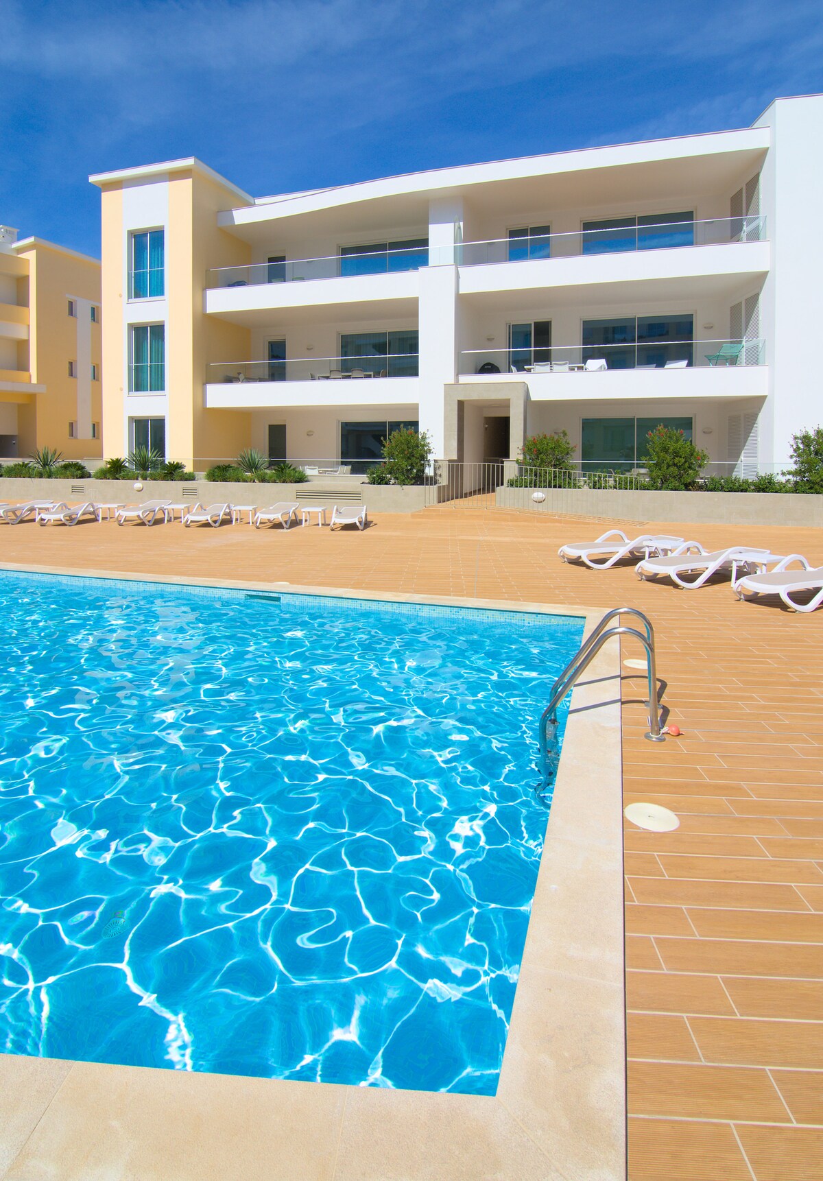 T3 modern apartment with large balcony and panoramic views over Lagos bay, in gated community with 2 outdoor pools and 1 indoor heated swimming pool, sauna, Turkish bath, gym, in door play ground to children's, with spacious living room and kitchen full equipped, 3 bedrooms, 2 bathrooms, air conditioning & inside box parking includes a barbecue