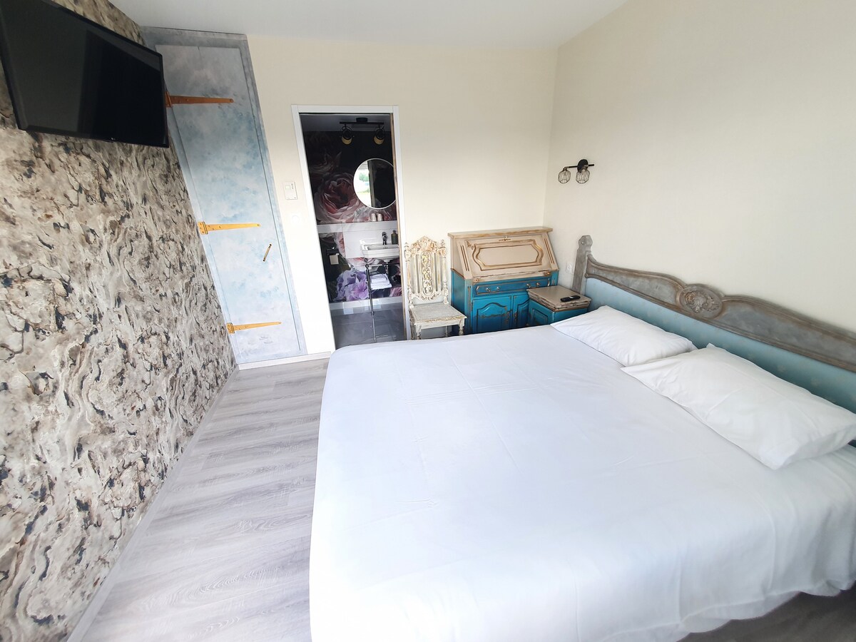 Uppgötvaðu persónulega svefnherbergið okkar sem tryggir þér bestu þægindi. Húsgögnin eru endurnærð frá Emmaüs Association til að fylgja þér meðan á dvölinni stendur.