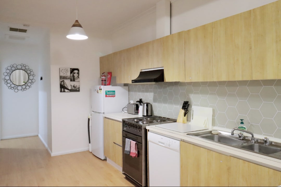 Þetta er einstaklingsherbergi, stúdíó með retróþema og 3 rúmum, hjónarúmi, king-einbýli og einu rennirúmi. Loftræsting / upphitun kerfisins tryggir þægindi meðan á dvölinni stendur. Í eldhúsinu er ísskápur með litlum frysti, tvöföld hitaplata (hentar vel til að hita upp máltíðir), örbylgjuofn og ýmsir pottar og pönnur. Það er lítið einkabaðherbergi með sturtu og salerni, þvottavél fyrir framhlaðning. The TV provided has free to air, an Apple TV box and fast free WIFI is available.
