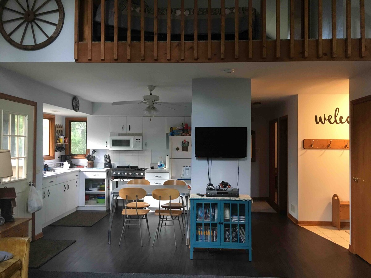 „Up North“ kofaskreytingar með nútímaþægindum. Sætur A-rammahús með þroskaðri rauðri og hvítri furu. Útisvæði til að hlaupa og leika sér eða slaka á við varðeldinn eða arininn inni. Hleðsla í boði. Komdu með eigin kol. Stofa með sjónvarpi, borðstofu, eldhúsi og búri, baðherbergi og svefnherbergi með queen size rúmi á aðalhæð. „Loftið“ uppi er með 2 svefnherbergi, 1 með 2 tvíbreiðum rúmum og hitt rýmið með queen-size rúmi og lestrarsvæði sem opnast út á einkasvalir.