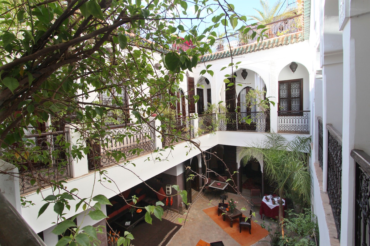 Riad er staðsett í miðju gamla Medina í Marrakech, 10 mn frá DJema El-fna Place og Koutoubia. Besti staðurinn til að kynnast töfraborginni Marrakech Riad er aðeins fyrir fjölskyldu- eða vinahópa frá Marokkó, Nb: engir mixte hópar milli Marokkó og út Marokkó ( stelpur og strákar ekki gift )