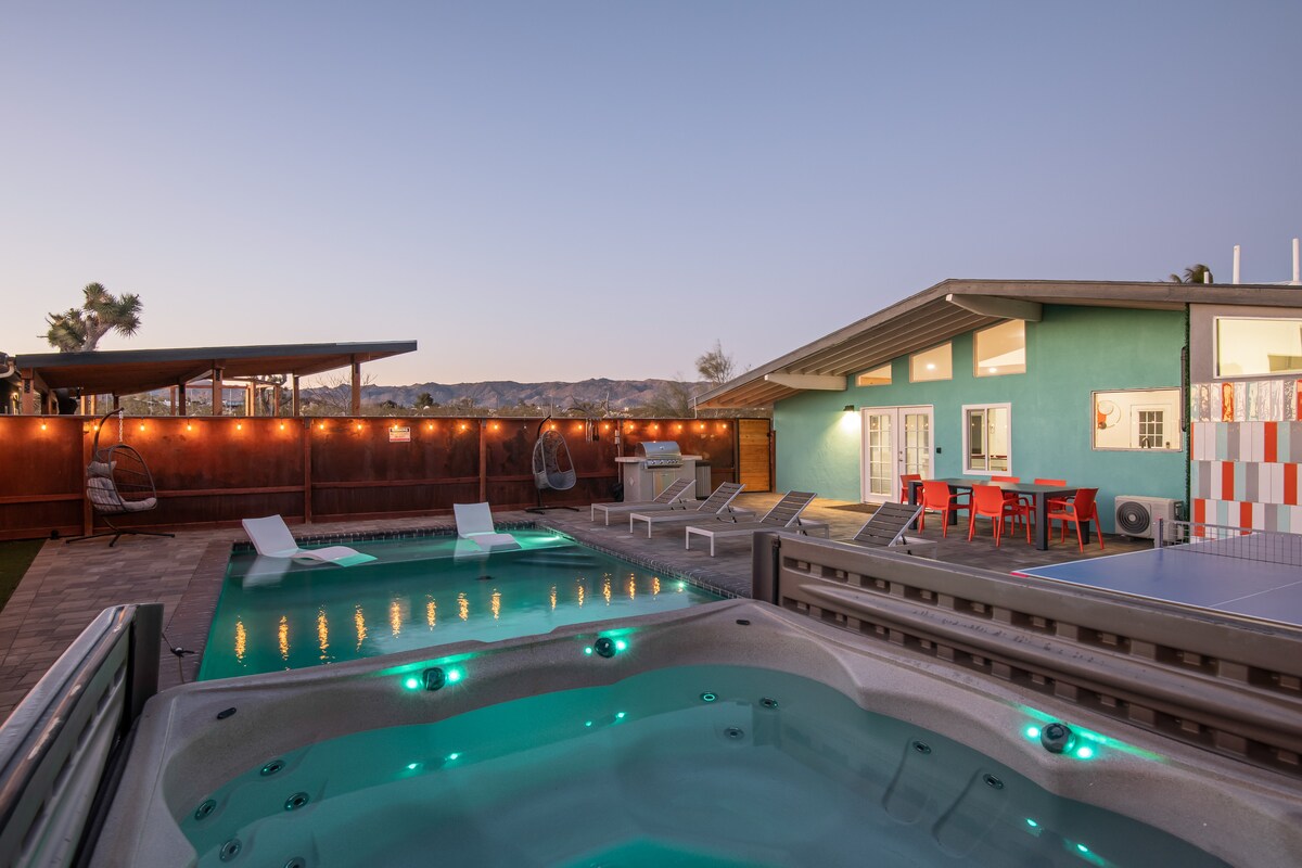Welcome to "Eternal Sun", a modern, activity-packed masterpiece dropped just outside of Joshua Tree National Park. This home has desert views for days, and will impress even the harshest of critics. Truly an experiential stay with activities to do around every corner. You and your group will have the opportunity to stargaze from our heated pool with expansive desert views, play pool & ping pong outdoors, watch a movie in an outdoor theater, and take a soak in the hot tub under the milky way.