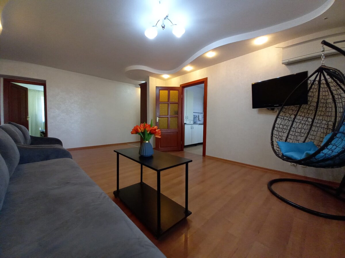 Апартаменты находятся в тихом и уютном районе города, в пешей доступности школа "Сымбат", спортивный центр «Жекпе-Жек», ледовый дворец, теннисный центр. К Вашим услугам апартаменты с гостиничным сервисом - отглаженные пастельные принадлежности, чистые махровые полотенца, одноразовые банные комплекты. В квартире есть все необходимое для Вашего комфортного проживания - бытовая техника, мебель, интернет Wi-Fi, кабельное телевидение, smart TV. Предоставляем все необходимые документы.