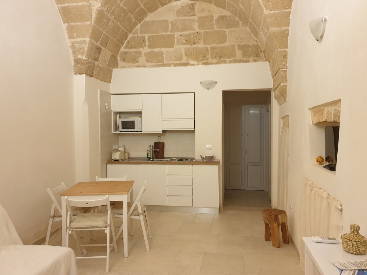 Cis: BR07401291000000188 NIN: IT074012B400033730 Upplifðu töfrandi tilfinninguna sem fylgir því að vera á milli fortíðar og nútíðar. Þetta er sögufrægt heimili! Gamaldags gólf og steinveggir eru bakgrunnur umhverfis með hönnunarmunum, gömlum leirmunum og húsgögnum frá staðnum. Stór einkaveröndin, með ljósabekk og heitri sturtu, vekur áhuga þinn: þú getur slakað á með vínglas við sólsetur, notið sólarinnar á þægilegum sólbekkjum eða útbúið kvöldverð í töfrandi Apúlíu andrúmslofti.