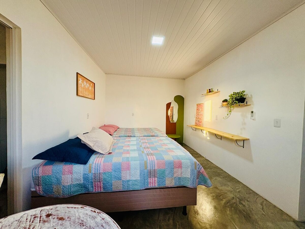 Notalegur skáli við Lagoa do Aruá, tilvalinn fyrir þá sem leita hvíldar, þögnar og tengsla við náttúruna. Eignin er með 2 svítur, fullbúið eldhús og svalir með útsýni yfir lóninu, fullkomin til að slaka á við hljóð fugla. Næstur við er veitingastaður með afþreyingu eins og kajakferðum, tröðubátum og róðrarbrettum. Matvöruverslun með heimsendingu í nágrenninu. Róleg staðsetning, 15 mínútur með bíl frá þorpinu Praia do Forte.