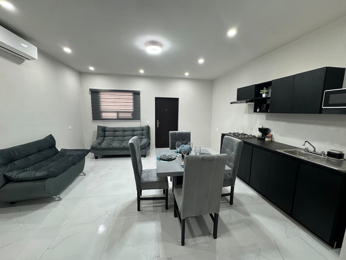 Njóttu þess að versla í Brownsville. Framkvæmd ferla hjá bandarísku ræðismannsskrifstofunni eða Cas. Við erum aðeins 2 húsaröðum frá Gateway International Bridge. Við erum með mjög þægilega íbúð og fallegan frágang með 2 svefnherbergjum og 2 fullbúnum baðherbergjum fyrir allt að 5 manns. Hjónaherbergi með king-size rúmi og fullbúnu baðherbergi. 2nd. Svefnherbergi með 2 einbreiðum rúmum og svefnsófa. Vel útbúin borðstofa og eldhús. Ísskápur 3 hurðir og rafmagnseldavél. Snjallsjónvarp, svalir með grilli. Líkamsrækt.