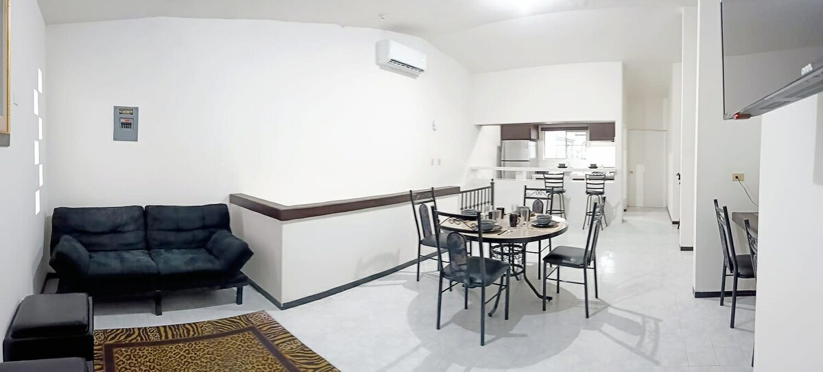 Falleg loftíbúð í miðborg Matamoros Njóttu dvalarinnar í þessari notalegu loftíbúð fyrir allt að fjóra. Hér eru tvö rúm í queen-stærð, handhægur morgunverðarbar og öll þægindi sem þú þarft: hratt þráðlaust net, kaffivél, blandari, örbylgjuofn og grill svo að þér líði eins og heima hjá þér. Óviðjafnanleg staðsetning: •5 mínútur frá Plaza Fiesta •10 mínútna fjarlægð frá bandarísku ræðismannsskrifstofunni • 10 mínútna fjarlægð frá alþjóðlegum brúm •35 mín frá ströndinni Hvort sem þú ert að koma til að vinna úr vegabréfsáritun þinni eða bara slaka á