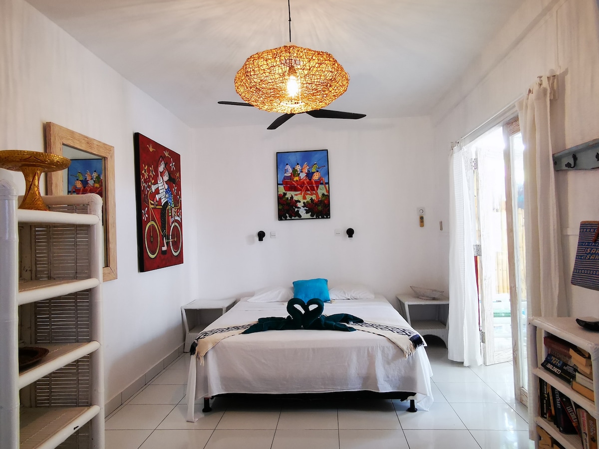 Notalegt gestahús nálægt Mataram og Senggigi svæðinu. Með sérherbergi, baðherbergi, stofu og eldhúsi með helstu eldunaráhöldum. Góður garður með sundlaug, lystigarði, borðtennisborði, borðspilum og bókum til að gera dvöl þína þægilegri hjá okkur. Við skipuleggjum gjarnan flutning í bæinn, til að flytja á flugvöllinn eða höfnina og dagsferðir til að skoða restina af Lombok eða Gili eyjunum.