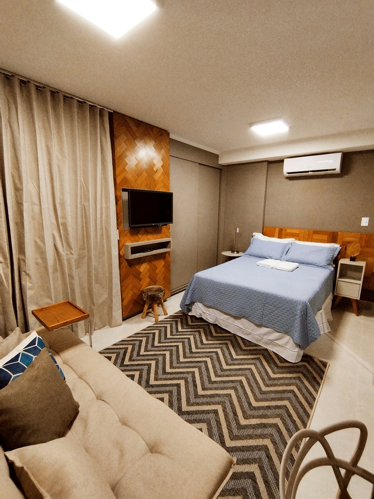 Apartamento super confortável tipo studio com localização imbatível para seus compromissos de trabalho e/ou lazer. ► Cama de casal com colchão de molas; ► Smart Tv 40” (incluso Netflix, Prime Video, Disney+ e Globoplay); ► Ar-condicionado; ► Ventilador turbo; ► Persiana tipo blackout; ► Roupeiro com cabides; ► Caixinha de som bluetooth; ► Mesa de estudos/trabalho com luminária; ► Sofá-cama para casal; ► Mesa para alimentação; ► Cozinha equipada para preparar pequenas refeições.