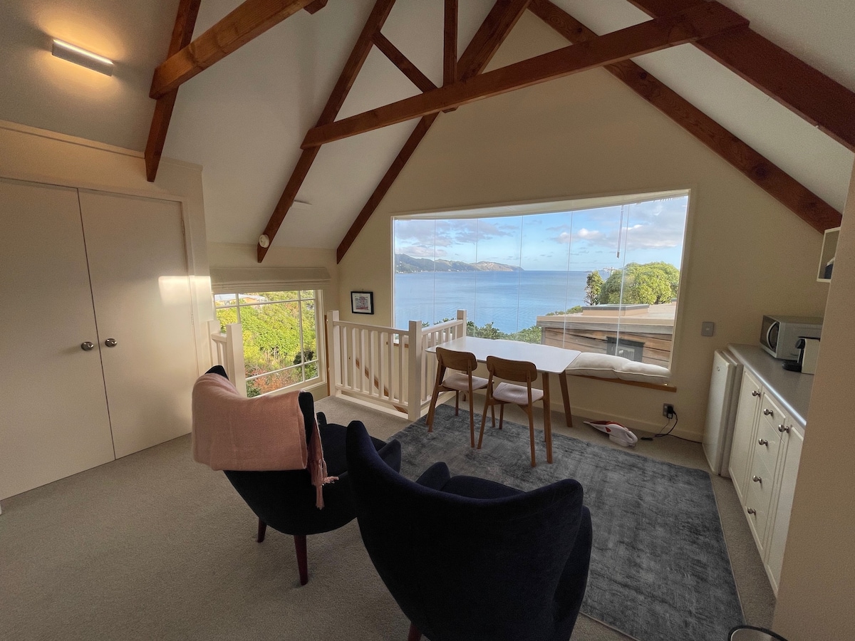 Stúdíóið okkar er staðsett við runnann rétt fyrir ofan heimili okkar og býður upp á ótrúlegt útsýni yfir Wellington-höfn. Ganga þarf stutta göngu upp á við en fyrir þá sem njóta útivistar og eru ekki feimnir við smá hreyfingu eru umbunin vel þess virði. Magnað útsýnið og notaleg gistiaðstaða gera það að verkum að upplifunin fer fram. Ef þú vilt hafa jafnt aðgengi eða ferðast með sérstaklega þungan farangur gæti verið að stúdíóið okkar henti þér ekki best.