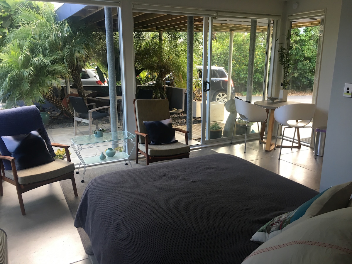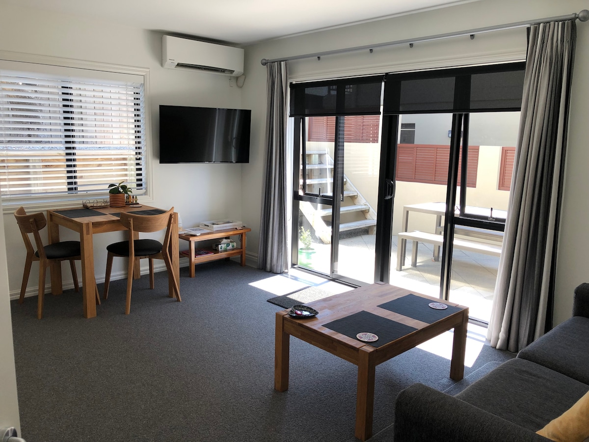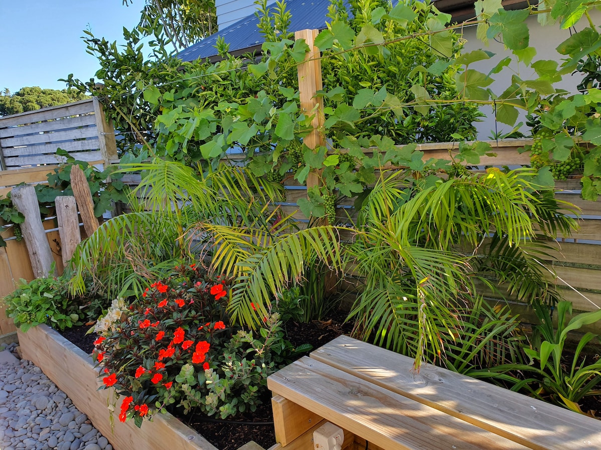 Þessi fallega útbúna eins svefnherbergis gestaíbúð er staðsett nálægt ströndum og verslunum. Með þægilegu queen-rúmi, rausnarlegri stofu og nútímalegum innréttingum mun þessi gestaíbúð líða eins og heimili þínu að heiman. Vel útbúinn eldhúskrókur gerir þér kleift að útbúa góðar máltíðir sem hægt er að njóta úti á verönd með útsýni yfir hitabeltisgarðinn. Kathy og Paul hlakka til að taka á móti þér í Central Parade okkar: Hidden Gem.