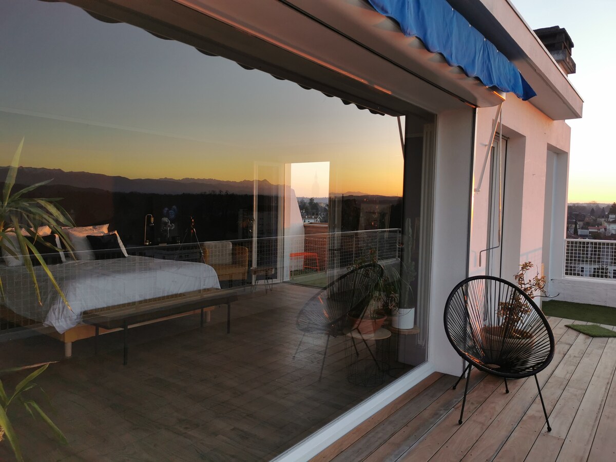Bienvenue dans l'univers de Bed & Views ! La suite Panoramique est un appartement unique à Pau ! Niché au 7 ème et dernière étage de la résidence Trespoey, vous disposerez d'un appartement avec home cinéma , moderne et fonctionnel. Par beau temps, vous ne pourrez qu'apprécier le toit terrasse de 40 m2. Avec des vues exceptionnelles sur toute la chaîne des Pyrénées, vous vous sentirez très privilégié(e)s. Un véritable tableau vivant vous attend !