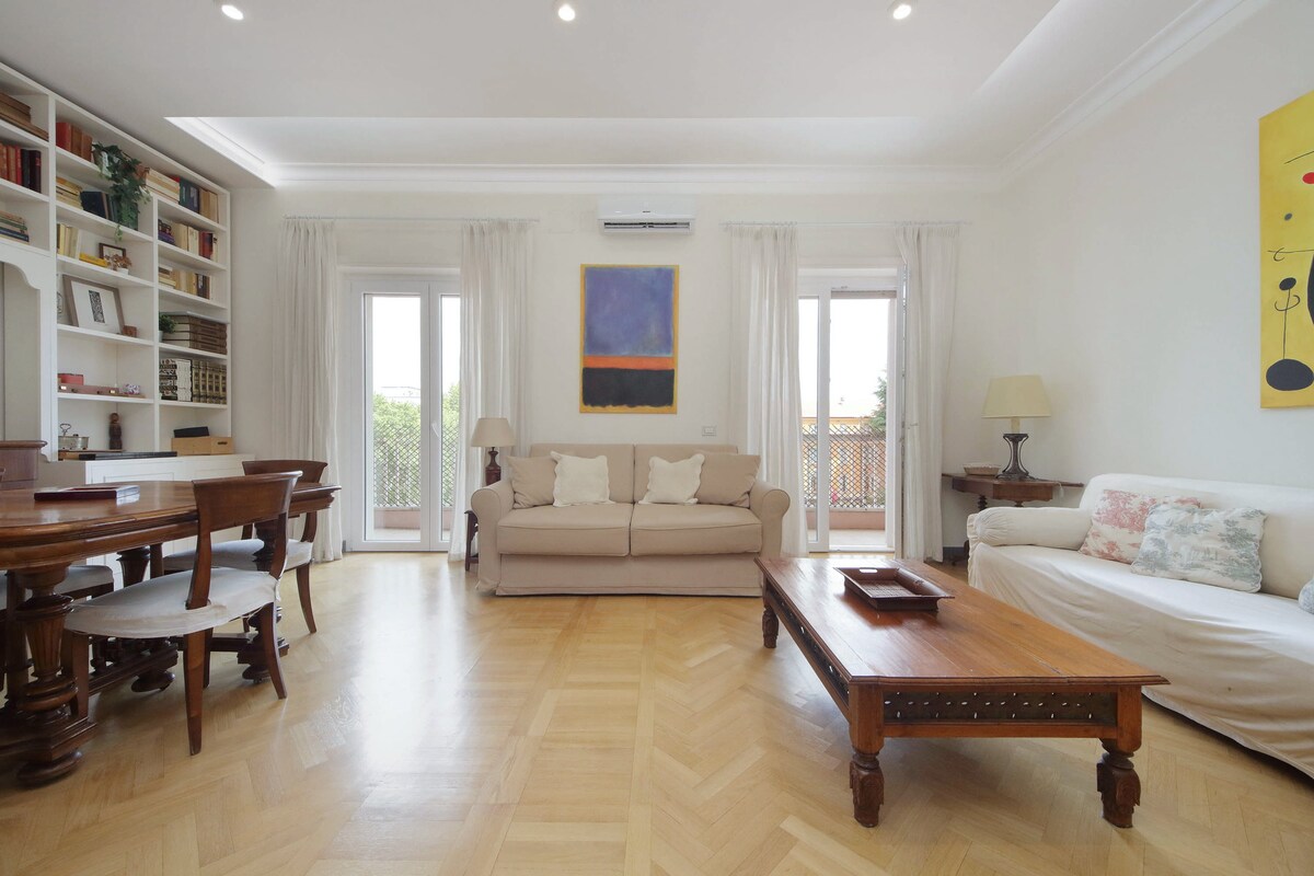 Njóttu rómverska ljóssins í þessari léttu, draumkenndu íbúð. Áherslan á smáatriðin endurspeglast í getu til að pakka ljósi á milli rýma og húsgagna til að láta fólki líða broslega og snyrtilega. Loftið á sjöundu hæð í glæsilegri byggingu í Roma Centro með stórri verönd með útsýni yfir Monte Mario Park og þaðan sem þú getur dáðst að hvelfingunni í San Pietro. Ultra-fljótur WiFi. Engin börn Innritun kl. 21:00/kl. 23:00 Auka 50 €. Engin innritun eftir kl. 23:00