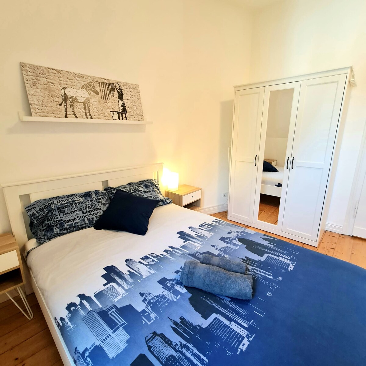 ECONOMY (1-4) | Air Conditioning | Washing Machine | Kitchen | Parking → Location: Altenburger Str. 2, 2nd Floor → Living Space: 36m² → 1 Bedroom with a large double bed (180x200cm) without footboard → 1 Separate Living and Dining Room with a fully equipped fitted kitchen → Sofa with sleeping function (160x200cm) → 55-inch Smart TV in the living room and 43-inch Smart TV in the bedroom with APP → 1 Bathroom (7m²) with shower and toilet, hairdryer → Washing machine → Hallway → Storage room