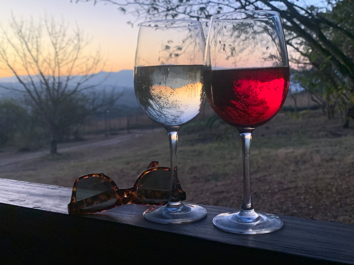 Við viljum bjóða þér í þessa einstöku og rómantísku upplifun í handbyggðu Jungle Treehouse úr gömlum gluggum. Hlýlegt og notalegt yfir vetrarmánuðinn vegna nýbætta hitateppisins okkar í queen-rúminu þínu. Njóttu garðsins okkar og nýbyggðu endalausu laugarinnar með mögnuðu fjallaútsýni og mögnuðu sólsetri . Þú heyrir fuglana hvísla allan daginn og sofnar við hljóð frumskógarins. Reyndu að koma auga á uglur og bushbabys sem sitja oft í jacaranda trjánum í kringum þig.