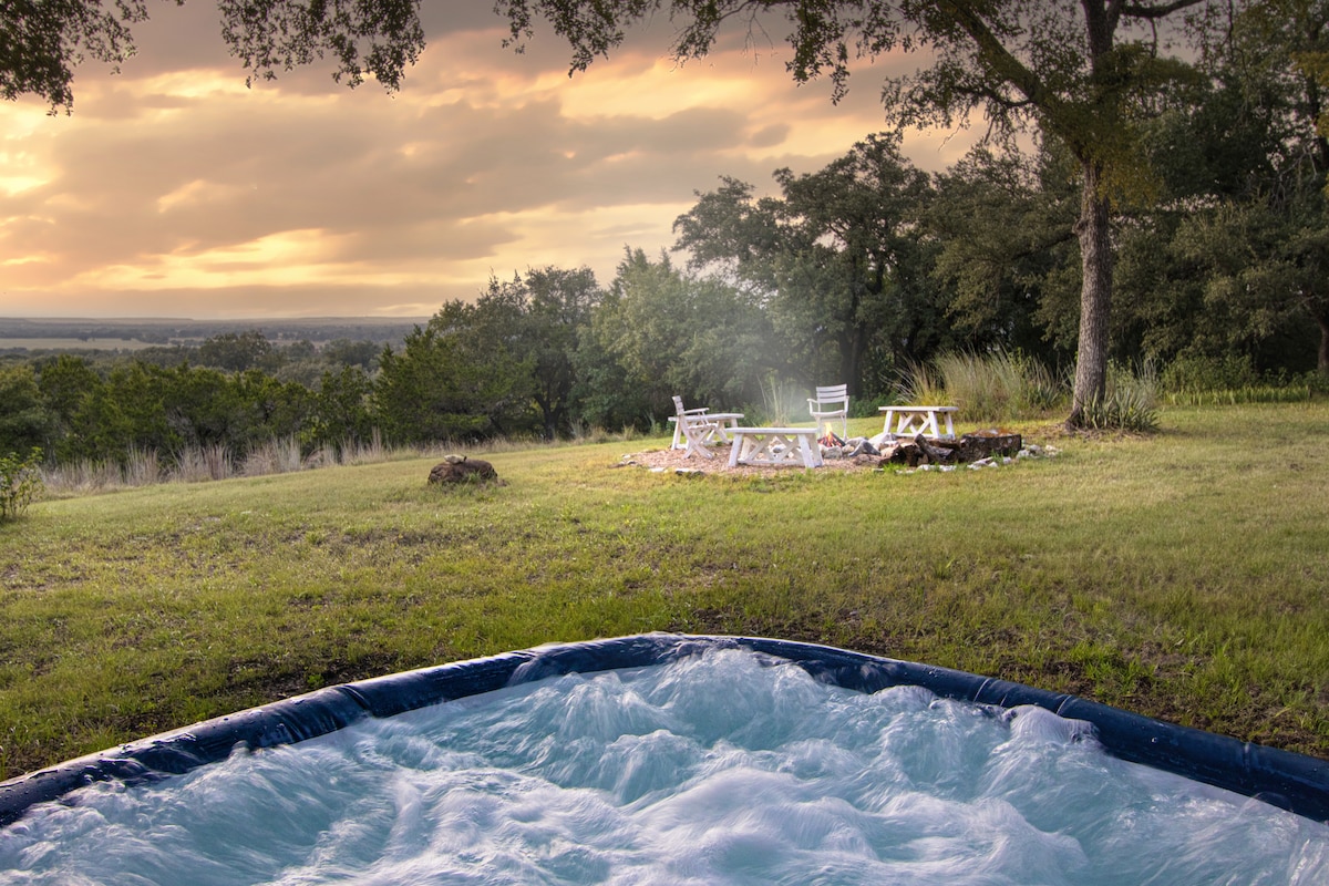 Stökktu frá ljósum borgarinnar og njóttu magnaðs útsýnis, allt frá fallegri sólarupprás með kaffi til stórkostlegs sólseturs með uppáhaldsdrykknum þínum og stjörnuhimni! Njóttu einkalaugarinnar og heita pottsins! Allt það friðsæla og rólega sem landið hefur upp á að bjóða en er samt nálægt hinum fjölmörgu þægindum í Waco! Aðeins 20 mínútna akstur til Baylor/The Silos/Magnolia/Downtown Waco. Nálægt Backyard Bar, BSR Cable Park, MCC og Extraco Event Center. Stæði fyrir hesta og nautgripi/hjólhýsi.