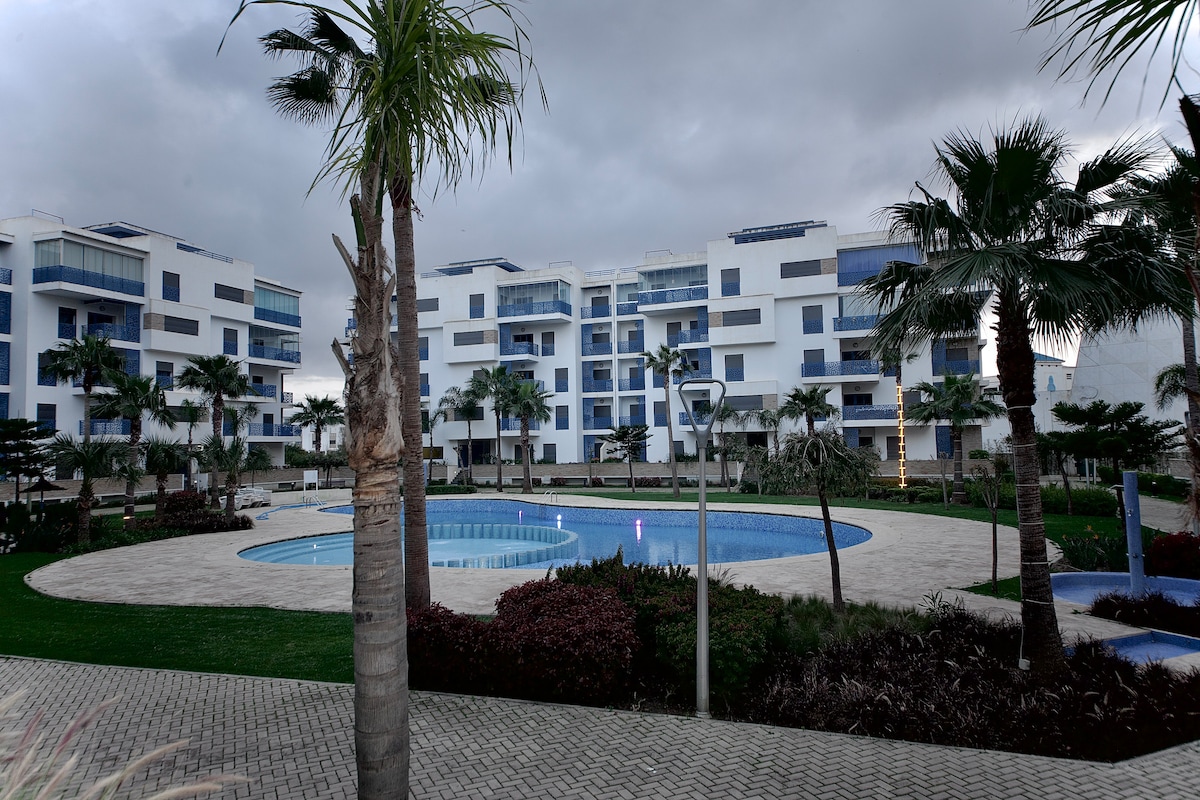 Dekraðu við þig með tilvalinni gistingu í Martil í þessari notalegu íbúð sem er staðsett í öruggu húsnæði sem er opið allan sólarhringinn, steinsnar frá ströndinni. Hér eru 2 svefnherbergi, rúmgóð stofa, fullbúið eldhús, 2 salerni og verönd með útsýni yfir hljóðlátan garð. Þú nýtur einnig góðs af sundlaug (opin frá 1. júní til 15. september), bílskúr í kjallara, grænum svæðum, lyftu, leikjum fyrir börn og þráðlausu neti með ljósleiðara svo að dvölin verði ánægjuleg.