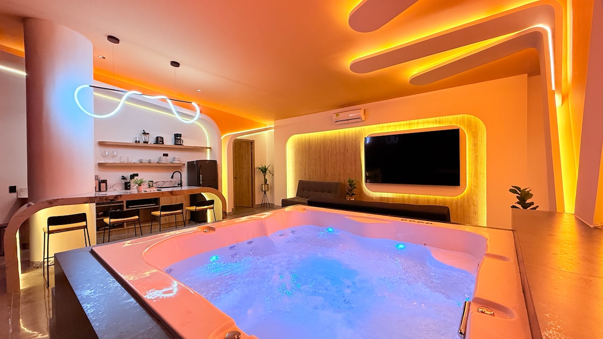 Frábær sundlaug á verönd byggingarinnar Nuddpottur, gufubad og ræktarstöð Svalir með einkajakúzzi /rúm í queen-stærð loftræsting Aðskilin svefnherbergi og stofa Veitingastaður/barstofa í anddyri. Herbergisþjónusta Þægindi og rúmgóð nútímahönnun. Fullbúið eldhús Frábært útsýni yfir borg og fjöll. Nálægt Provenza bestu börum/veitingastöðum borgarinnar. Fataþvottavél og gasþurrkari í íbúðinni. Táknræn bygging í Medellin sem býður upp á orku Einkanuddpottur á 11. hæð á svölum 1.000 kv. Fætur Hratt þráðlaust net Innritun allan sólarhringinn