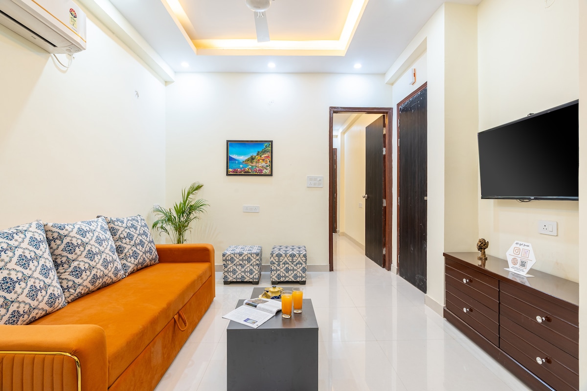 Stílhrein þægindi í hjarta Rajnagar Extension Notaleg og nútímaleg dvöl í miðborg Rajnagar-viðbyggingarinnar. Gott aðgengi er að verslunum, kaffihúsum, salonum, matvörum og matarbásum á staðnum. Allt er þetta steinsnar í burtu. Fullbúna íbúðin býður upp á fágaðar innréttingar, mjúk ljós og þægileg húsgögn. Tilvalið fyrir vinnuferðir, fjölskylduferðir eða borgarfrí. Láttu þér líða eins og heima hjá þér á öruggu, gönguvænu og líflegu svæði með öllu sem þú þarft í nágrenninu.