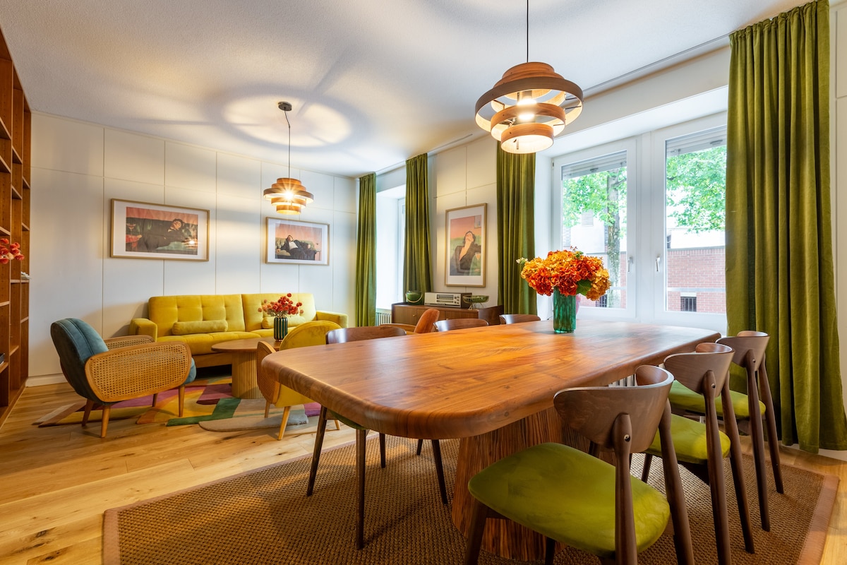 Íbúðin okkar býður upp á nútímalega hönnun: baðherbergi með regnsturtu, handklæðaofni og sérinnréttingum. Herringbone parket skapar stílhreint andrúmsloft. Eldhús með hágæða tækjum (Bora, V lest, uppþvottavél, þvottavél/þurrkari). Svalir eru stór, róleg staðsetning, býður upp á mikið næði og fallegt útsýni. Philips HUE lampar fyrir andrúmsloftsljós. A Samsung The Frame breytir rýminu í listasafn. Þægilegt rúmið fyllir tilboðið um að líða vel!