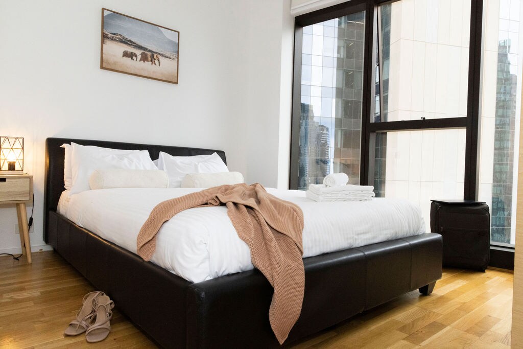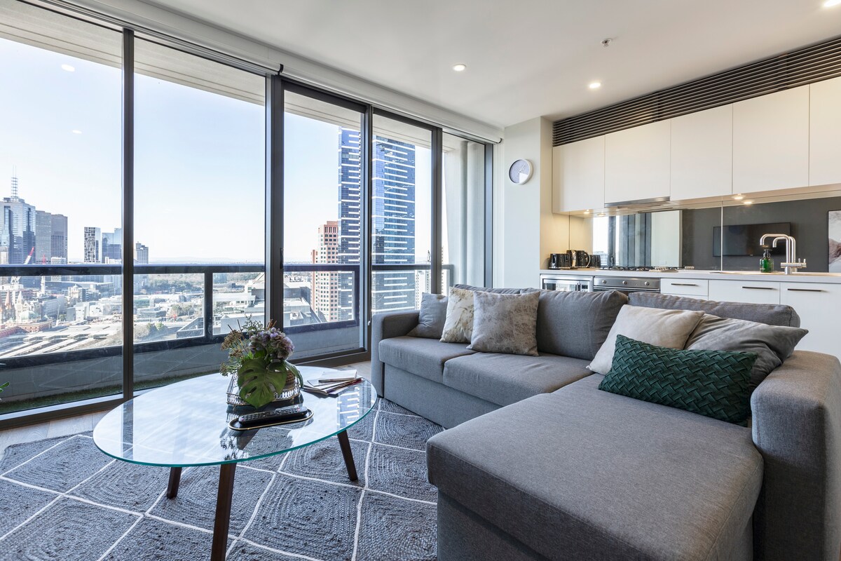 Borgarútsýni! Fullkomlega staðsett í hjarta Melbourne með allt á dyraþrepinu! Stutt gönguferð að Crown Complex hinum megin við ána eða farðu í gönguferð niður að verslunum Collins St og Bourke St Mall. Njóttu margra af frægu matsölustöðum Melbourne, horfðu á sýningu á hinum mörgu leikhúsum, fáðu þér drykk á einum af alræmdum börum eða verslunum þar til hjartað slær! Hvort heldur sem þú verður sökkt í það besta sem borgin hefur upp á að bjóða. Southern Cross Station er í aðeins nokkurra mínútna göngufjarlægð.