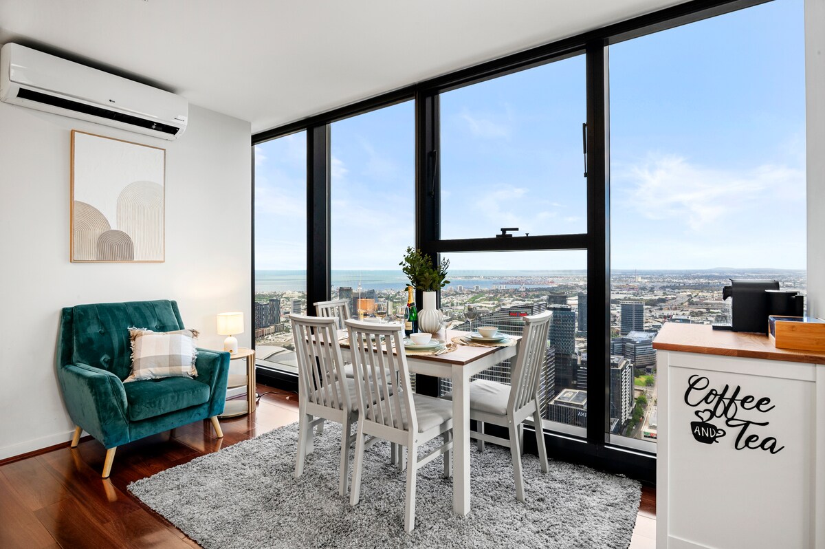 Skemmtu þér í vel verðskulduðu fríi á þessum tilvalda stað nálægt Yarra-ánni og Crown Entertainment-hverfinu með yfirgripsmiklu útsýni yfir Melbourne og flóann! Nútímalegur griðastaður með öllu sem þú þarft til að þér líði eins og heima hjá þér og njóttu dvalarinnar! ★Ótakmarkað þráðlaust net og Netflix ★Nútímaleg tæki ★Þægindi fyrir rúmföt og bað ★Þvottavél og þurrkari ★Nám/vinnuaðstaða ★Loftræsting og upphitun ★Móttökugjöf ★Þægileg rúm í queen-stærð ★Aðgangur að sundlaug, líkamsrækt og sánu
