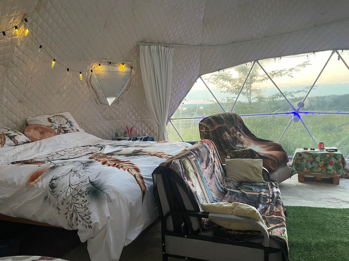 Frábært Geodesic tjald við rauða klettinn við stöðuvatn