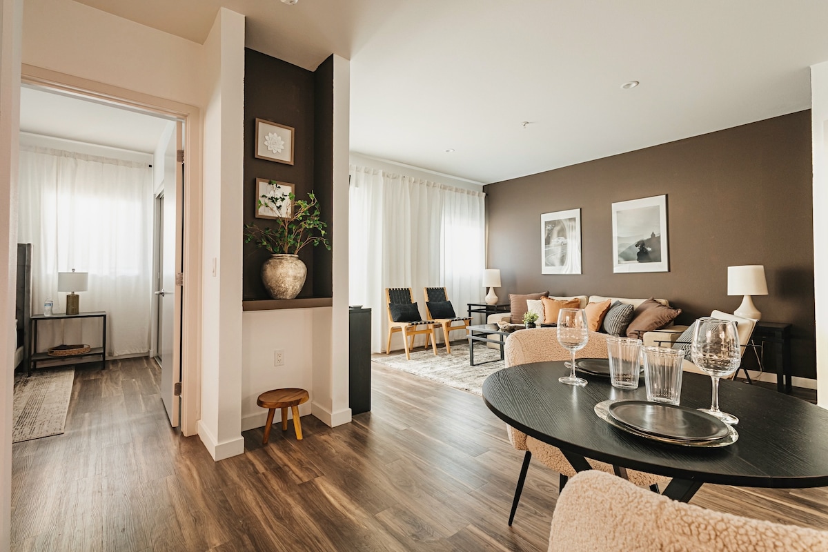 Upplifðu nútímalegt líf í hjarta West Hollywood! Þetta nýuppgerða heimili er fullkomið fyrir kröfuharða ferðamenn, fagfólk og fjölskyldur. Gakktu til Santa Monica Blvd, Fairfax, Melrose og Arts District. Njóttu háhraða þráðlauss nets, snjalltækja, standandi skrifborðs, loftræstingar og bílastæða á staðnum. Þetta glæsilega afdrep er með pláss fyrir fjóra gesti, fullbúið eldhús, þvottavél/þurrkara og notalega stofu og býður upp á þægindi og þægindi við hvert tækifæri