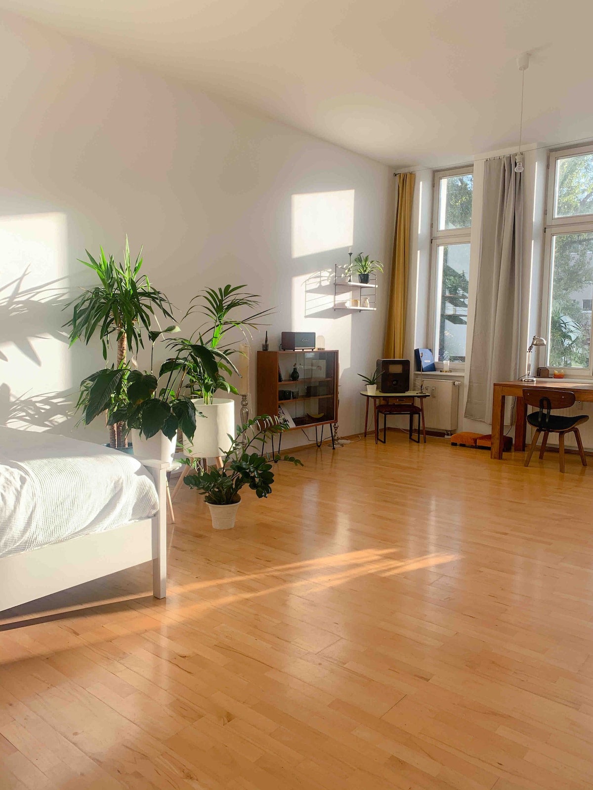 Velkomin í íbúðina mína, sem ég deili aðeins þegar ég er í burtu. Með 3,5 metra háu loftum, gluggum frá gólfi til lofts og stórum svölum er hún full af birtu og fersku lofti. Stórt hjónarúm og svefnsófi gera það tilvalið fyrir pör eða vini. Fullbúið með uppþvottavél, þurrkara og einstaklingshitun. Þessi græna vin hefur stíl, er notaleg og full af plöntum og er aðeins í 3 mínútna fjarlægð frá neðanjarðarlestinni í miðborg Mitte - fullkomin til að skoða Berlín og njóta morgnanna með kaffi á svölunum.
