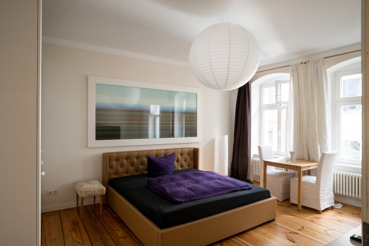 Mjög miðsvæðis en samt mjög hljóðlát, fulluppgerð og frekar rúmgóð íbúð með listrænu ívafi fyrir þína sérstöku dvöl. Hár endir, fullbúið eldhús og baðherbergi með stórri regnsturtu. Svalir sem snúa í suðvestur. Mjög þægilegt hönnunarrúm í king-stærð sem og notalegur sófi til að ná sér eftir útivist í Berlín. Museum Island, Brandenburg Gate, uppáhalds kaffihús Mitte, veitingastaðir o.fl. & Friedrichstr-lestarstöðin er steinsnar í burtu. 1. hæð með lyftu.