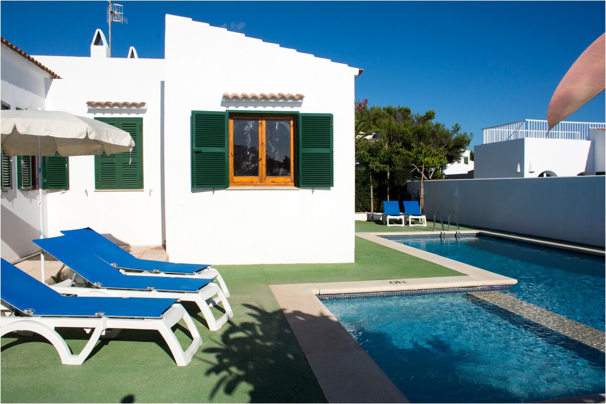 Rúmgóð 130 m² einkavilla með 250 m² útisvæði, staðsett í mjög rólegu íbúðahverfi nálægt Ciutadella. Í aðeins 4 mínútna göngufjarlægð er að finna matvöruverslun, veitingastaði og aðgang að ströndum Cala en Brut og Cala en Blanes. Engin þörf er á bíl. Hún er með þremur svefnherbergjum með hjónarúmi, tveimur baðherbergjum og svefnsófa og rúmar allt að átta gesti. Útisvæði með sundlaug, garði, verönd, laufskála og grilli. Loftkæling, hratt þráðlaust net, bílastæði, rúmföt og handklæði innifalin