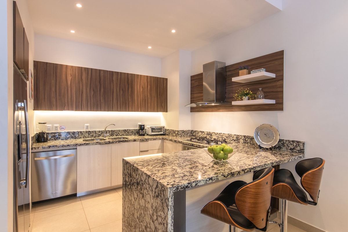 🚧 ATHUGAÐU: Opinber stofnun er að sinna byggingarframkvæmdum við götuna fyrir utan aðalinngang byggingarinnar. Verkefnið felur í sér að fjarlægja steinlagningu og getur valdið ryki og hávaða. Stórt eins svefnherbergis, tveggja baðherbergja íbúð staðsett inni í Rincon de Almas – einni af nýjustu íbúðum Zona Romantica. Gakktu að ströndinni og bestu veitingastöðunum, verslunum og galleríunum sem Vallarta hefur upp á að bjóða.