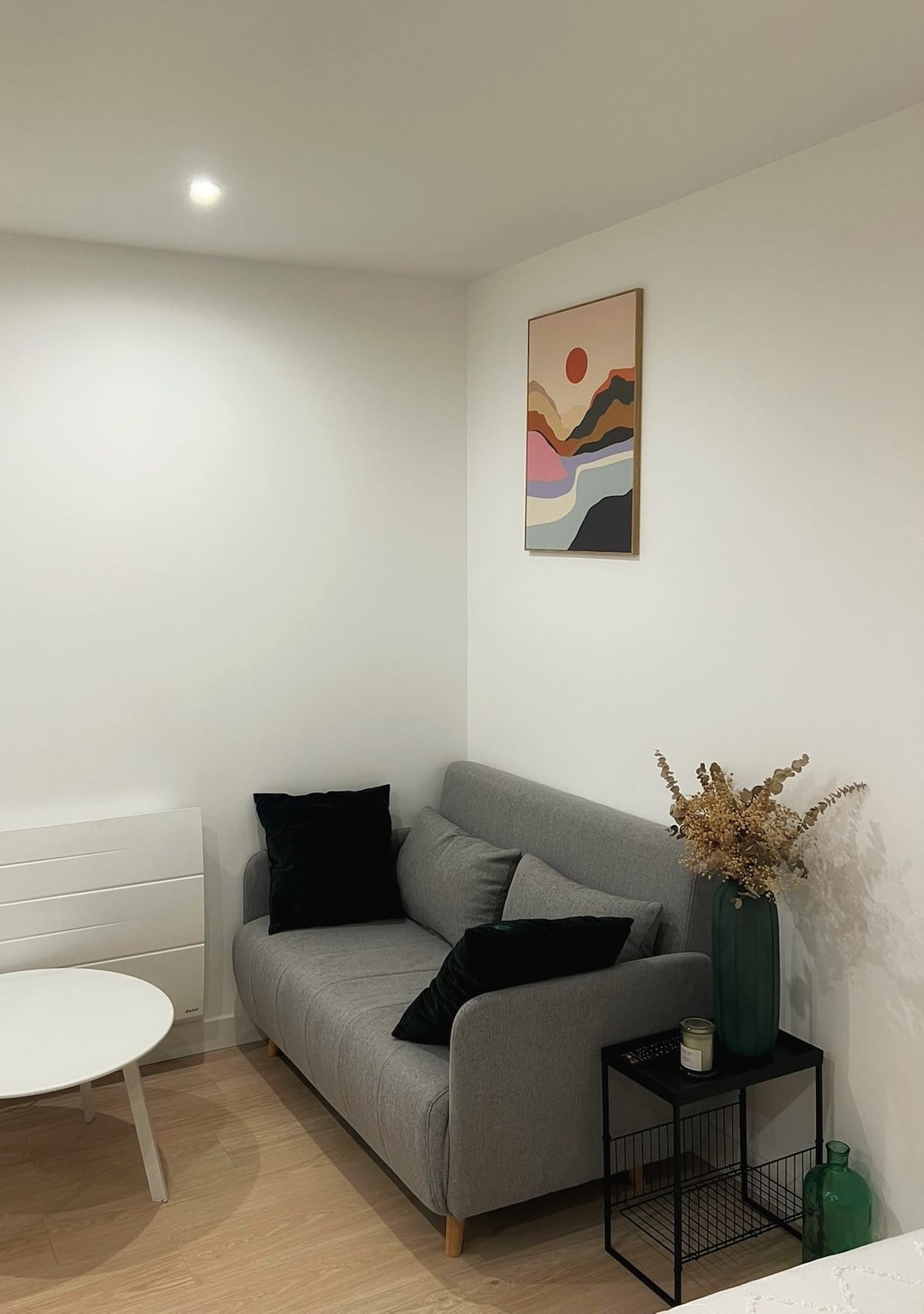 Studio of 24 m² in a new residence on the 2nd floor, elevator, close to the center of Mérignac, the Mérignac-Soleil shopping area, airport with tram line A, 2 minutes from the bypass, 50 m from the bus. Húsgögn og heimilistæki eru glæný. Rúllulokari 1 rúm í queen-stærð fyrir 2 með lökum, sæng, koddum og teppi. Lítið bekksæti fyrir tvo sem er ekki hægt að breyta Hreinsivörur, ryksuga, handklæði, viskustykki, hárréttari, hárþurrka... Þráðlaust net með ljósleiðara. Öruggt hjólarými