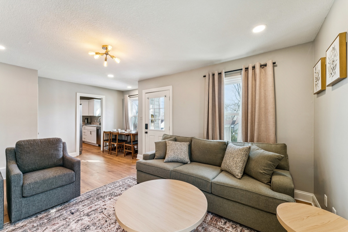 Hadley-bústaðurinn er frábær staður til að koma með fjölskylduna í skemmtilega frí eða fullkominn fyrir vinnuþarfir þínar. Þessi glæsilega og nútímalega kofi er í 3 mínútna fjarlægð frá I-35 og er þægilega staðsettur til að komast fljótt hvert sem er í KC-neðanjarðarlestinni. Þetta er rólegt hverfi með breiðum gangstéttum í göngufæri við veitingastaði eða verslanir. Bústaðurinn er með endurnýjaðan innréttingar árið 2022, risastóran girðingarbakgarð og langa innkeyrslu með góðu bílastæði.