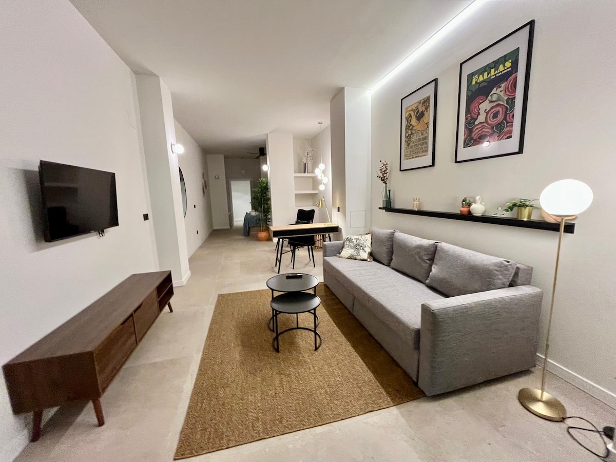 Einkaloftíbúð á einu af bestu svæðunum í Valencia. Staðsett í rólegu umhverfi, nálægt miðbænum og Turia Garden, með frábæra tengingu við ströndina og höfnina. Tilvalið fyrir pör eða fjölskyldur með barn. Það er með hjónarúmi og svefnsófa. Njóttu nútímalegrar hönnunar og allra þæginda: upphitunar, loftræstingar, þvottavélar, þurrkara, snjallsjónvarps, þráðlauss nets og fleira. Þægindi og stíll á einum stað!