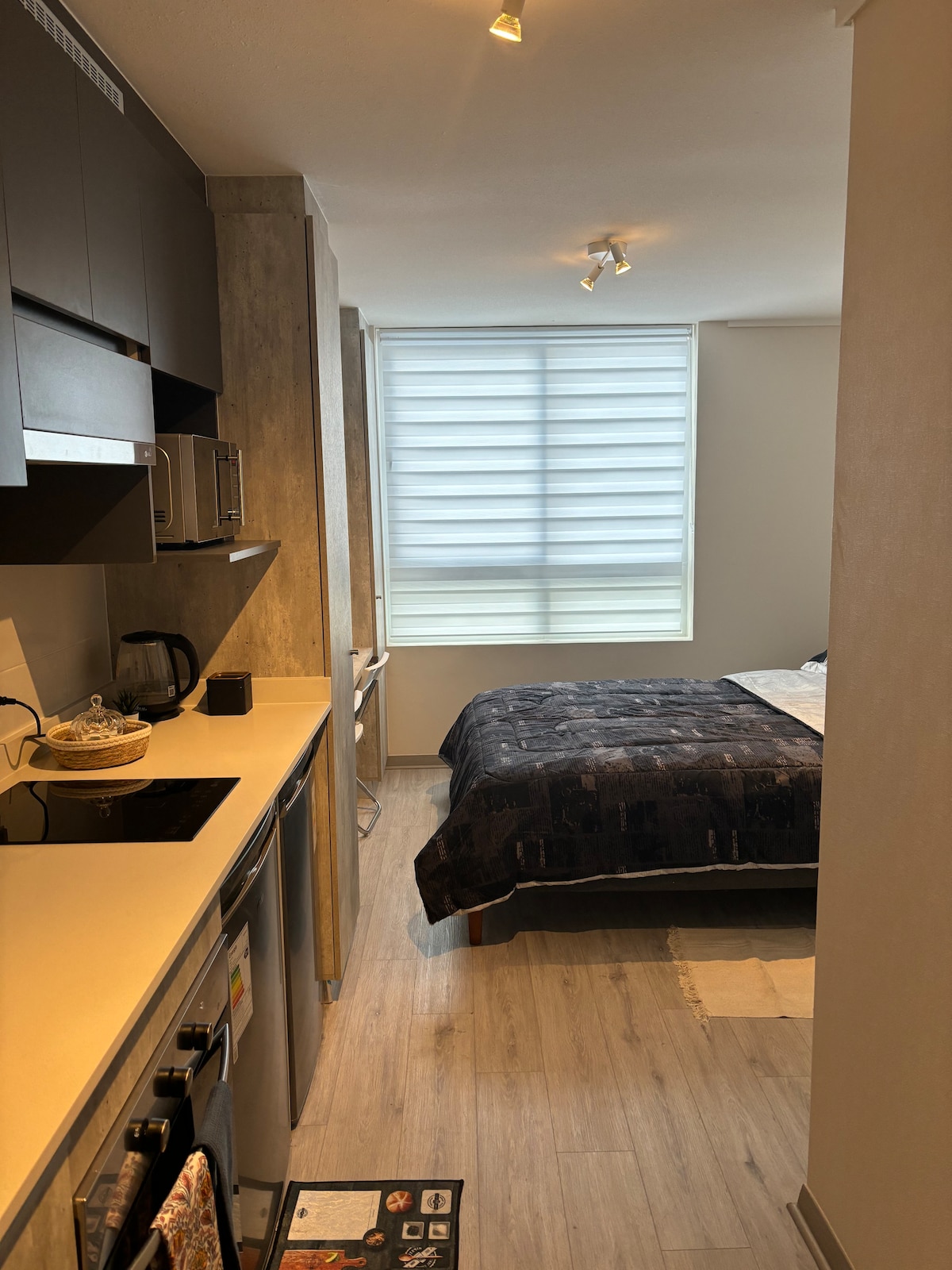 Cozily designed and functional, this 37 m² studio offers a unique open-plan space with 1 bedroom featuring a King-size bed and closet, 1 fully equipped kitchen, 1 full bathroom, 1 living area, Smart TV, Wi-Fi, and 1 parking space. Daily housekeeping and a 24-hour front desk are included, just like a hotel. You’ll have access to shared spaces such as a gym, coworking area, restaurant and panoramic rooftop. Located in El Golf, just steps from the metro, restaurants, shops, and business centers.