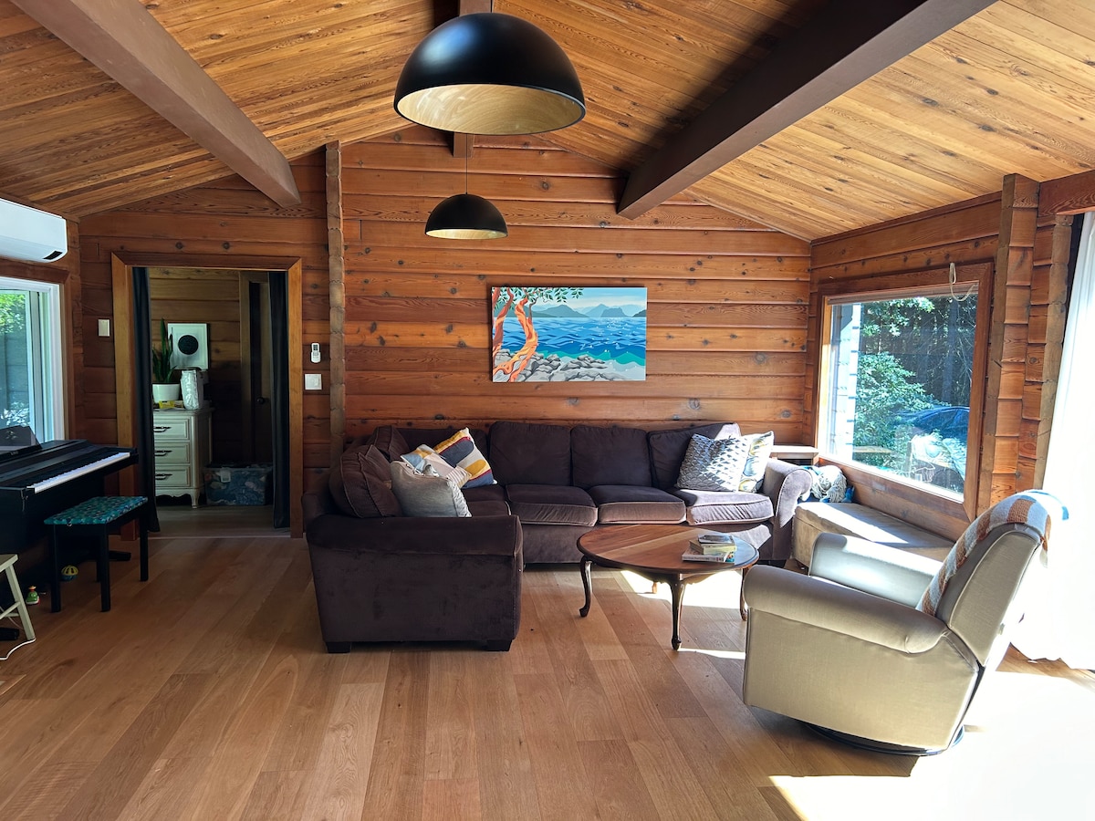 Þessi heillandi bústaður er innan um tignarleg tré og býður upp á friðsælt afdrep með íburðarmiklu queen-rúmi, fullbúnu eldhúsi og rúmgóðu fullbúnu baði. Hvelfd loft og mikið af þakgluggum flæða yfir rýmið með náttúrulegri birtu sem skapar bjart og rúmgott andrúmsloft. Fullkomlega staðsett í nokkurra mínútna fjarlægð frá þægindum Snug Cove og ýmsum fallegum slóðum. Þetta er tilvalið frí fyrir afslöppun og ævintýri.