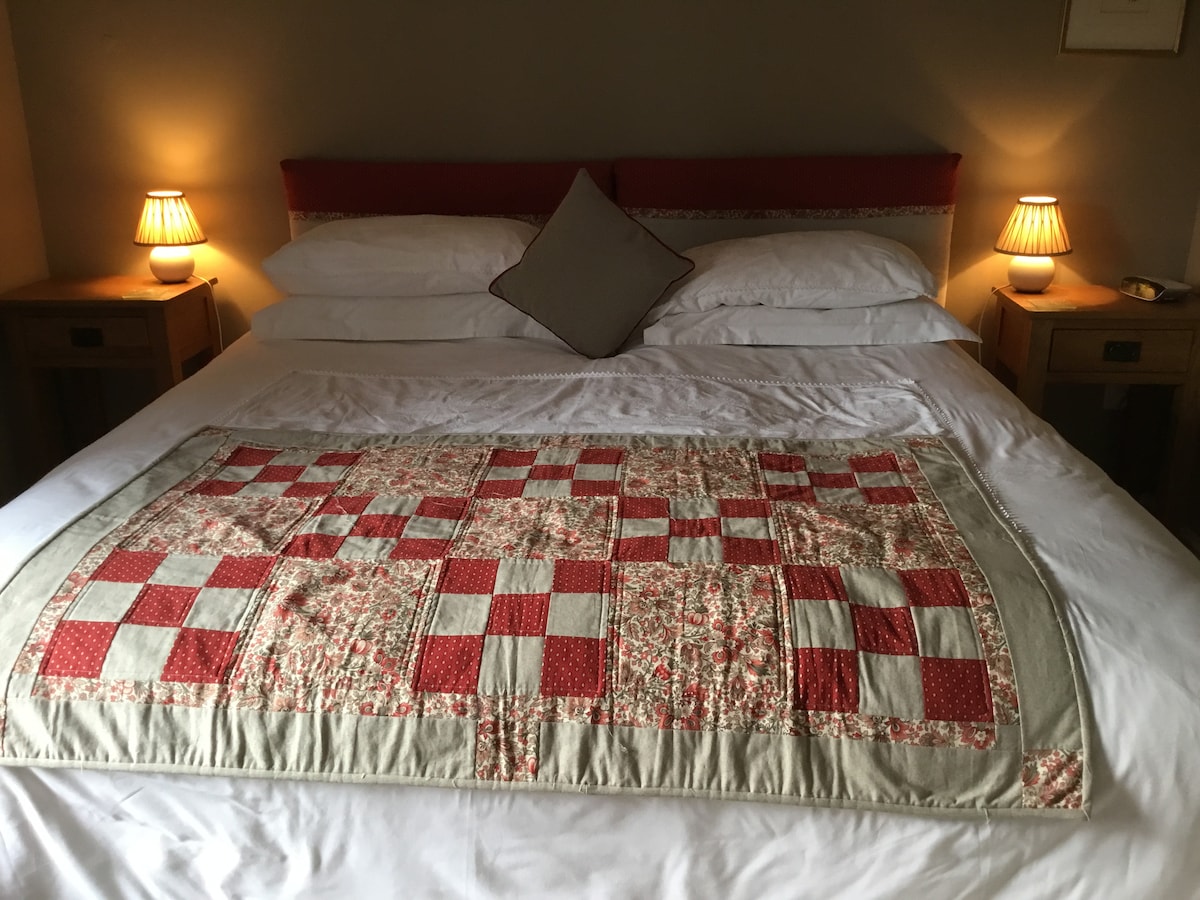 Our only purpose made Double room overlooks the garden and has an ensuite bathroom that has a basin, toilet and electric shower. There is tea, coffee and complimentary biscuits in all rooms along with freeview Tv with built in Dvd player. A double wardrobe with hangers is sited in the corner of the room and a bedside lamp and central heating make this a very cosy room.
