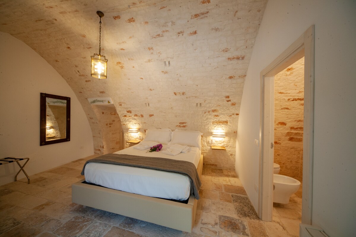 Luxury room inside a historic stone masseria in the Valle d’Itria, perfectly located for Alberobello, Locorotondo and Matera. Elegant space with vaulted stone ceilings, a double bed and a separate alcove with a single bed, private bathroom, air conditioning, satellite TV, minibar, safe and coffee machine. Breakfast served in shared areas. Garden and seasonal outdoor pool included. Indoor spa available by reservation for an extra fee.
