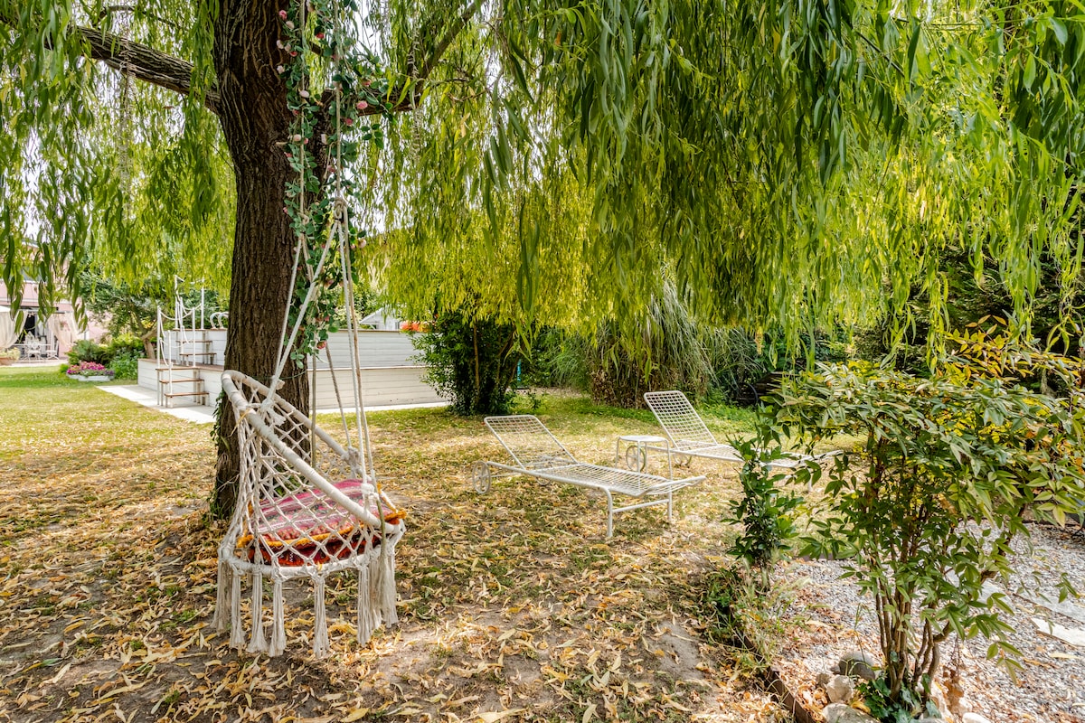 Yndisleg og notaleg risíbúð á stað sem er á góðum stað, aðeins í boði fyrir gesti, í nokkurra mínútna fjarlægð frá sögulega miðbænum, nálægt lestarstöðinni OG FERRARI-SAFNINU. Rólegt og rólegt íbúðahverfi, ÓKEYPIS BÍLASTÆÐI UNDIR HÚSINU. Stórt tvíbreitt svefnherbergi með þriðja rúmi, stofa með arni og svefnsófa, nýtt eldhús, baðherbergi með sturtu, þvottavél og þurrkara, ókeypis þráðlaust net, A/C, 42"sjónvarp Garður með garðskál Morgunverður