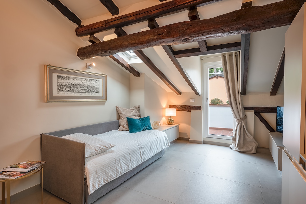 Altana með hallandi þaki, forréttindi með útsýni yfir turnana tvo og innri verönd með útsýni yfir turna og þök Bologna, virðulegt og einstakt. Fullbúið og fínt innréttað, með ótakmarkað WiFi, HD 50 "sjónvarp, Netflix, loftkæling og rúmar allt að 4 gesti. Íbúðin er í glæsilegri byggingu sem nýlega hefur verið endurnýjuð í sögulega miðbænum og er í göngufæri frá helstu kennileitum borgarinnar.