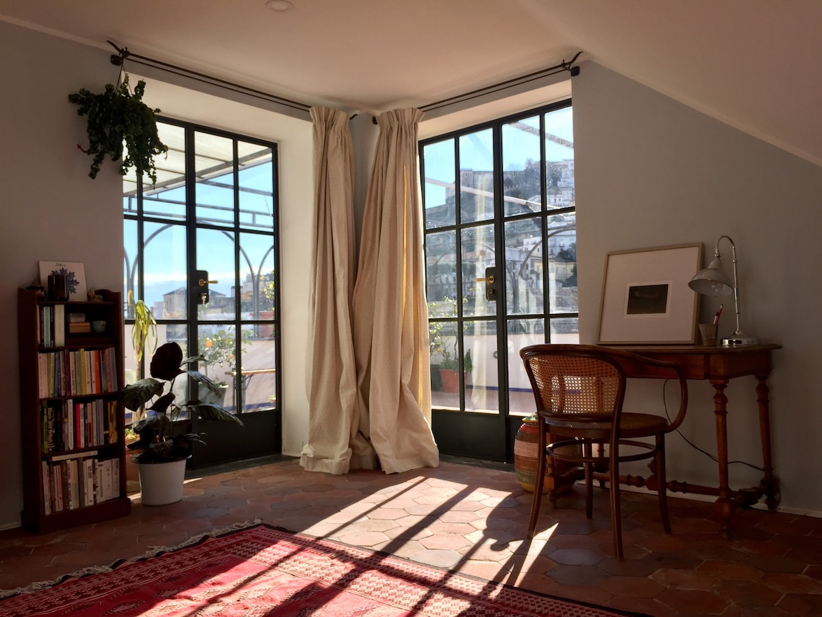 Stúdíóið mitt er lítið griðastaður fyrir ofan þakgarðana með víðáttumiklu útsýni yfir Napólí, upp að kastalanum og út í átt að Sorrento-skaga. Það er staðsett í sögulega Montesanto-hverfinu, aðeins nokkrum skrefum frá hinum forna Pignasecca-markaði, líflega slagæðinni Via Toledo sem leiðir að sjó, og nálægt bóhem-torgum sögulega miðborgarinnar. Íbúðin er vel tengd, með báðum neðanjarðarlestarlínum innan 5 mínútna göngufæri til að tengjast flugvellinum og aðaljárnbrautarstöðinni.