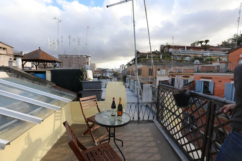 Mjög lítið rómantískt og kyrrlátt athvarf í einu af miðlægustu og mest heillandi hornum Rómar. Þetta var einn af þjónum göfugrar rómverskrar fjölskyldu sem átti höllina á 17. öld. Gættu þín á fallegu upprunalegu bjálkunum sem einkenna þetta brúðkaupsheimili... þú gætir slegið höfuðið!... eða misst það vegna fegurðar Rómar. Frá samliggjandi verönd íbúðarinnar sérðu eitt fallegasta útsýnið yfir borgina. Code Cise/Cir 28290. Cin: IT058091C2RP3QUCCG