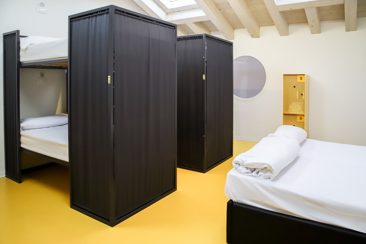 Private room for up to 7 Guests. For private and exclusive use. Each bed has a privacy panel and is equipped with reading light, electricity plug, shelf! Big, bright window in each dorm. FREE Linen kit (including 1 pillow case, 2 bed sheets, and 1 duvet), Wi-Fi and A/C. Secure luggage storage in room. Towels included. Come to join our Social Bar: There is a wide choice of weekly musical events, always free for our guests ;)