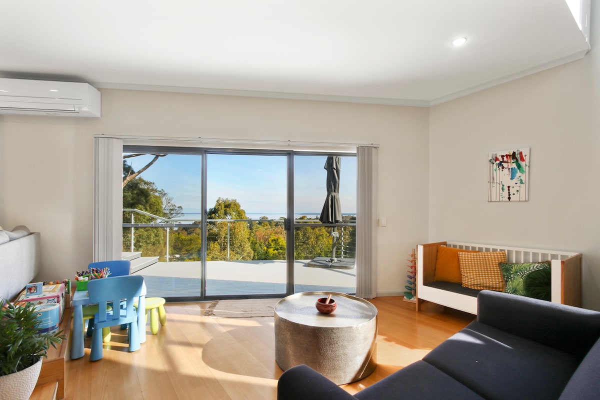 Þetta er staður til að slaka á og slaka á (stór pallur með grillaðstöðu og öruggum bakgarði.( fyrir lítinn hund) Njóttu morgunverðar á veröndinni sem er umkringdur trjám með útsýni yfir Bancroft-flóa. Vaknaðu endurnærð/ur við fuglahljóðið og röltu niður í þorpið. Eftir ævintýri dagsins lýsa chimanea upp og fá sér rólegan drykk í garðinum eða notalegan upp að rafmagnseldinum í setustofunni. Mest af öllu slakaðu á í fallega þorpinu Metung.
