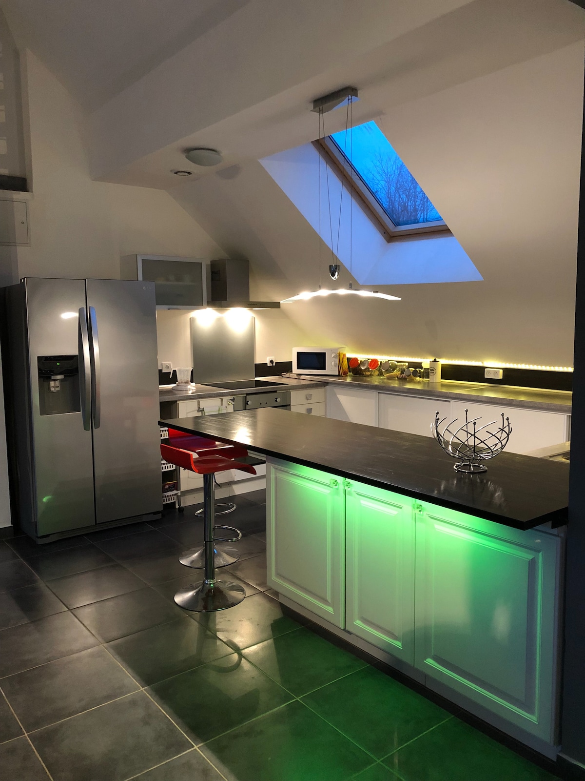 Magnifique appartement indépendant, de plus de 120 m2 au sol, entièrement rénové, dans une maison individuelle comprenant 3 logements, quartier très calme. Totalement équipé: - cuisine américaine complète: four à chaleur tournante, plaques à induction, frigo américain, lave-vaisselle, micro-ondes, cafetière à grains DeLonghi, vaisselle, etc... - grande pièce de vie très lumineuse (2 grandes baies vitrées), climatisée, avec vue imprenable sur la nature. - mobilier design, éclairage à leds.