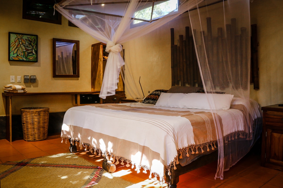 Jungle Bungalow is a charming . stone and brick house, large patio, close the beach, stores, restaurants, spacious patio with outdoor grill overlooks a lush gated garden with bananas and papaya trees. Rétt fyrir utan hliðið er hin fallega náttúrulega Horcones-á. Það er með eina drottningu og eitt hjónarúm, eitt sem hægt er að komast að með stiga sem fellur út frá veggnum. Hún er fallega innréttuð og smekklega með fullbúnu eldhúsi, loftkælingu, viftum og aðgangi að þvottahúsi. Endurlífgar með sjarma.