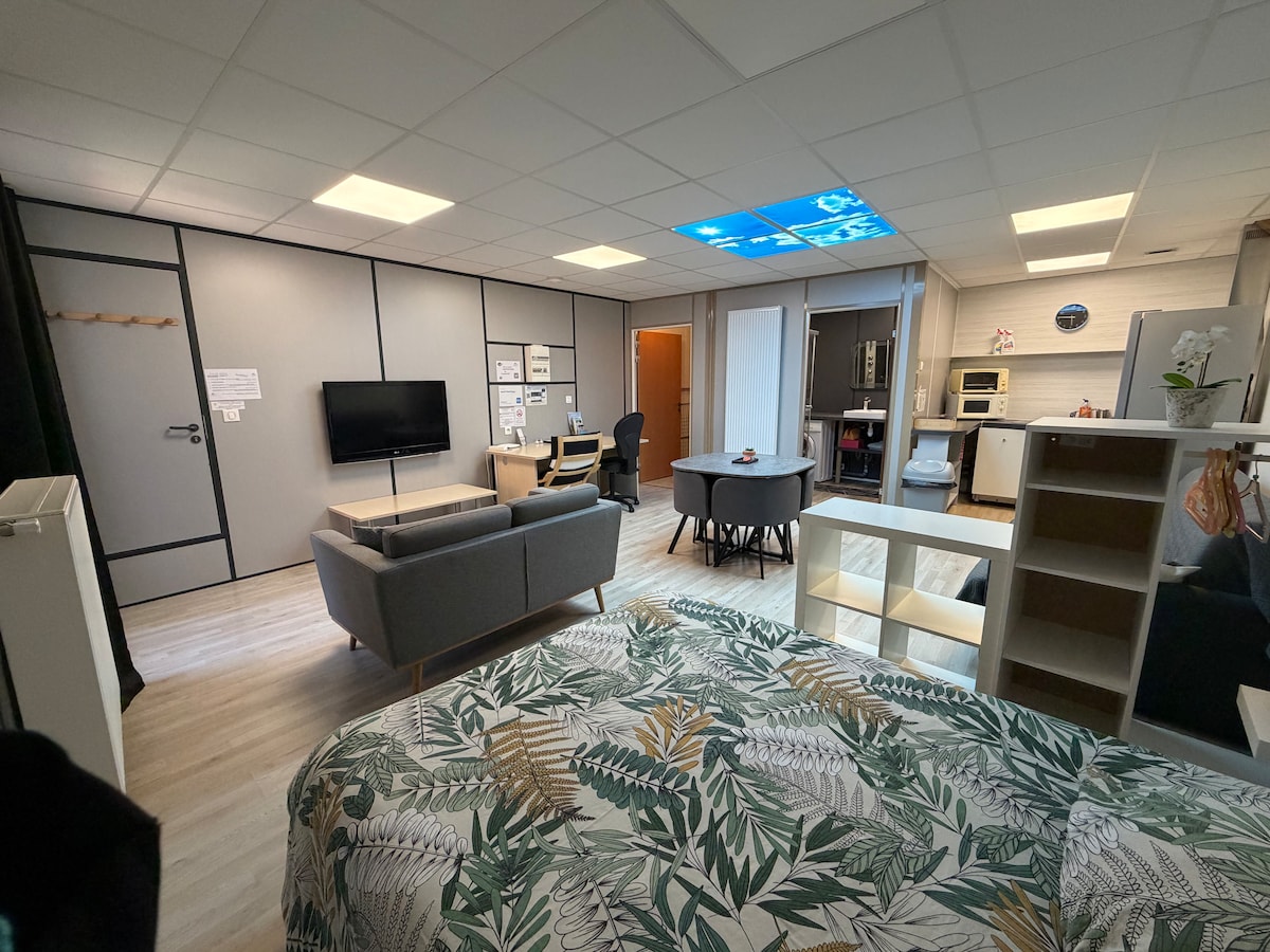 Spacious 40 sqm air-conditioned studio, rated 2-star furnished accommodation, located on the first floor of a family house with private entrance. Ideal for up to 4 guests, business or leisure stays. Fully equipped kitchen, fiber Wi-Fi, workspace, TV area, double bed (140×190cm) + sofa bed, bathroom with shower, separate toilet, covered terrace. Bed linen and towels included. Close to Plaine de l’Ain, Ambérieu, Bugey NPP, UFPI. No pets.