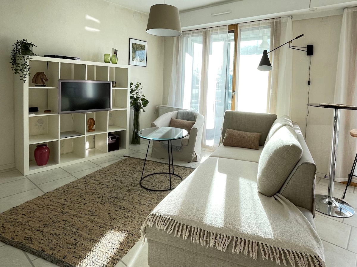Verið velkomin á heimili þitt að heiman í Ferney-Voltaire! Þessi bjarta og rúmgóða íbúð hefur allt það sem þú þarft til að slaka á og njóta dvalarinnar! Tvö svefnherbergi með tvennum svölum með fallegu útsýni, notalegum hornum til að slappa af og glæsilegu yfirbragði. Það er aðeins „10 til 15 mínútur“ að rútum og matvöruverslunum og því er staðurinn afar þægilegur en samt friðsæll. Hvort sem þú ert hér til að skoða þig um, vinna eða hvílast mun þér líða vel, tengjast og láta þér líða vel um leið og þú stígur inn! Ég hlakka til að taka á móti þér!